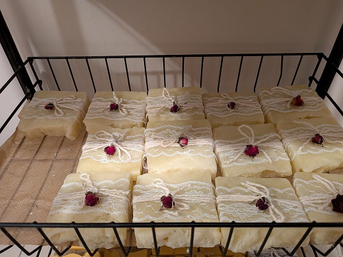 As I added extra oil only at the end, this soap isn't very hard; it feels softer than a commercial bar, but that's a nice feature.